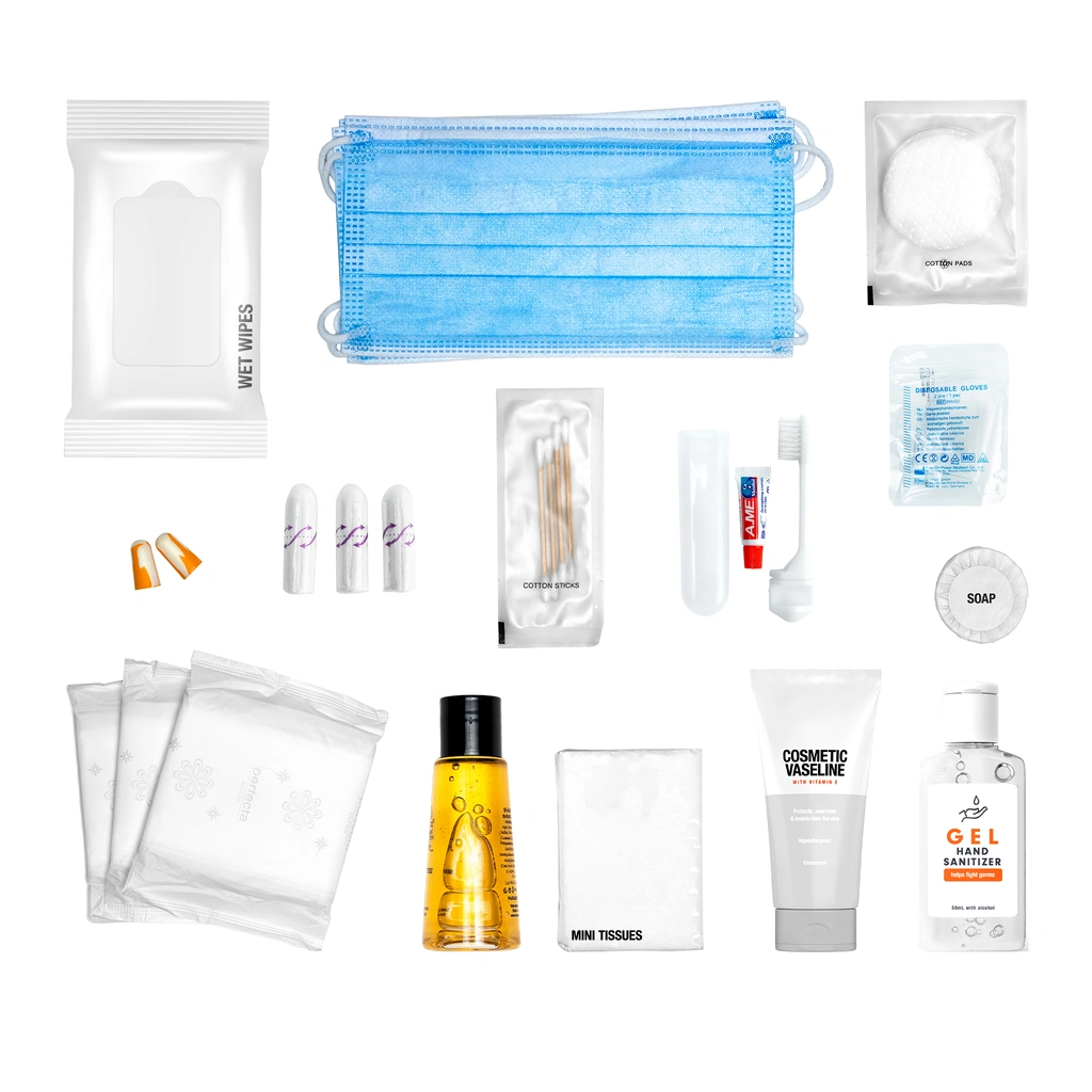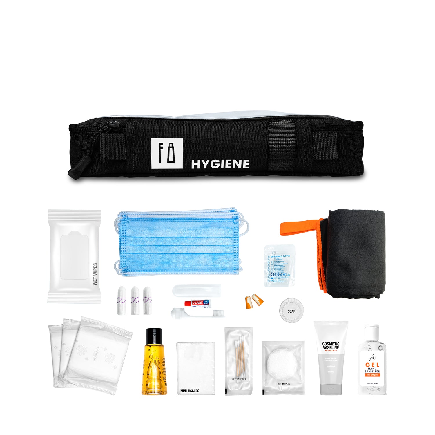 Innhold: Hurtigtørkende håndkle, Hygieniske masker, Tannbørste med tannkrem, Desinfeksjonsgel, Fuktighetsgivende servietter, Hygieniske servietter, Vaseline, Tamponger, Kosmetiske q-tips, Bomullsdotter, Sjampo, Bind, Såpe, Ørepropper